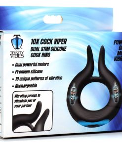 This premium silicone cock ring is stretchy, comfortable and packed with powerful vibration for you and your partner! The viper prongs line up with your partners clitoris to stimulate them as they ride your shaft! The dual motors are placed on either side of the ring for a balanced and intensely powerful vibration. With 10 different patterns to choose from, enjoy finding the perfect setting to pleasure both you and your partner!
