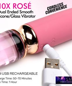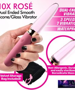 Silicone vibrators are some of the sexiest on the market, but glass dildos are a favorite for penetration. Combine both glass and silicone with this Vibra-Glass Dual Ended Vibrator! The silky smooth, premium silicone makes up one side of the vibe while the strong and smooth glass makes up the other end. Enjoy feeling the buzzing vibration through the core of both with 3 speeds and 7 patterns of vibration to enjoy! Notice the subtle differences between silicone and glass as the vibration comes through both ends in different ways. Made out of borosilicate glass, this end is non-porous, durable and super smooth. The plush silicone end is phthalate-free and body-safe when used with water-based lubricants. To recharge, plug in the USB cable included. Rated as IPX6 waterproof, you can expose this to strong water jets in a shower but it should not be submerged under water. Wash with warm water and mild soap after each use and then rinse and spray with a toy cleaner before wiping dry and storing in a cool, dark place.
