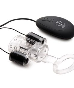Give yourself a genuine cock tease with this Dual Cock Teaser with Cock and Ball Ring! The stretchy, TPR sleeve has a nubbed interior that reacts to the powerful bullet vibes to tease and tantalize your shaft! The dual vibrating bullets slip into parallel pockets on either side of the sleeve. With a snug, tight fit, the bullets give an even vibration that spreads through the shaft, head and even down to the balls! Enjoy controlling the powerful vibration from the corded remote. Choose between 3 speeds and a whopping 17 patterns to enjoy! Try something new every time when you combine the vibration speed and patterns. Enjoy the sleeve during masturbation, foreplay or simply to tease yourself until you’ve been edged and milked!