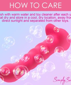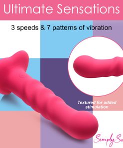 Bring something sweet into your sexy collection with the Simply Sweet ribbed dildo! Not only does this pink dildo have a round head that helps stimulate the G-spot or P-spot, a set of 3 pronounced ribs that add tantalizing texture and is made out of super silky silicone, it’s also a vibrator! Indulge in 3 speeds and 7 patterns that add intensified pleasure to your penetrating poundings! Control all the settings with a battery-operated remote control that can be used from up to 26 feet away! Made out of premium silicone, it is phthalate-free and body-safe to use with any water-based lubricant. The wide, heart shaped base is compatible with most strapon harnesses and has a suction cup so you can ride hands-free, too! Want to get really wet and wild? Rated as IPX7 waterproof it can handle being underwater for up to 30 minutes, so you can bring it in the bathtub for short term play or in the shower for long, steamy sessions! After use, simply wash the warm water and mild soap, then spray it with toy cleaner and let it air dry. Recharge using the USB cable provided. Replace remote control batteries as needed.