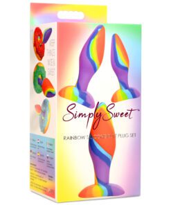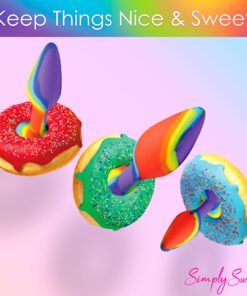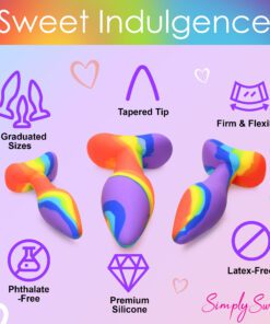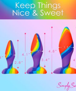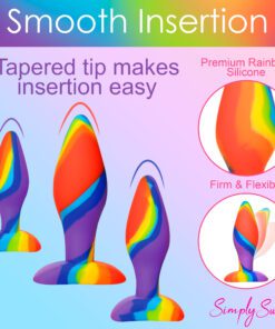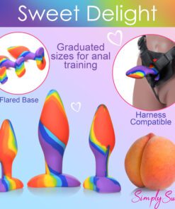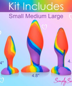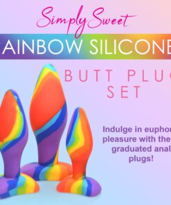 Train your derriere with this set of 3 graduated butt plugs! These brightly colored rainbow plugs start small and get larger as you get more experienced. The tapered tip makes insertion easy and the wide, flared base ensures they are safe to use for backdoor fun. Made out of latex-free, phthalate-free, silky smooth, premium silicone. These plugs are body-safe and best used with water-based lubricants only! Start small and work your way up, or get one for yourself and the other for a partner so you both can train your booties! To clean, use warm water and mild soap, then rinse it off and spray it with a toy cleaner before letting it air dry. Only for anal use. Store in a cool, dry location, away from direct sunlight and separated from other toys.