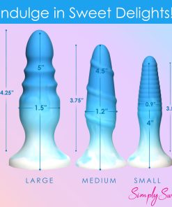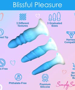 This set of three plugs gives you the best in variety of size and texture! With three graduated sizes of small, medium and large, you can train your derriere to take bigger and wider toys! Additionally, you can have fun doing it and explore more sensation by enjoying the variety of textures offered in this set! Each plug is firm and flexible for your comfort and enjoyment! The small plug has a ribbed texture. The medium plug has a corkscrew line spiraling around the shaft. Finally, the third and largest has a larger head and dips along the shaft that end in a large, round bottom. These dips allow for your sphincter to experience stretching and contracting a few times with every insertion! After you get used to it, you’ll love the way it feels!