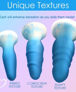 • Three Textured Plugs: Ranging from small to medium to large, these three plugs also have unique textures too! The small one is ribbed, the medium has a corkscrew, and the large has bumpy dips. Each will enhance your sensitive behind as you slide them inside!