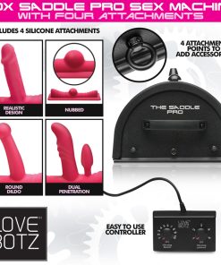 Get back in the saddle and see how long you can ride this Saddle Pro Sex Machine! Built to be durable and handle up to 485 lbs, it’s for those of us who want intense, long-lasting pleasure without worrying about getting too wild or rough for the machine to handle! The rideable base begs for your legs to wrap around it and for you to sit on one of the attachments as the intense, rumbling vibrations buzz through the toys inside you! Enjoy the sturdy, solid feeling of metal covered in thick plastic beneath you. Slip in a phthalate-free, premium-grade silicone attachment. There are four delicious ones to choose from! Enjoy a large, realistic dildo. Try out along dildo with a round, ball end to hit your sweet spots such as the A-spot, G-spot, or P-spot. Get double penetrated with the dual attachment of a ribbed dildo and a small anal plug! Or enjoy rubbing one out on the delicious nub attachment!Â
