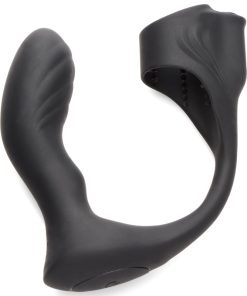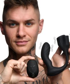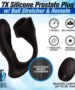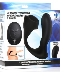 Combine cock and ball pleasure with prostate stimulation with this powerful, vibrating plug! The curved, angled plug is designed to press directly onto your prostate and stimulate it. Connected to the plug is a wide ring that wraps your scrotum above the balls to stretch them. The short and wide ball stretcher is textured with nubs on the inside. As you enjoy the prostate plug vibrating and milking you, you can also experience enhanced sensations and delayed orgasm from the ball stretcher that is gently pulling your testes away from your body as it buzzes you with vibration! Choose between 3 speeds and 4 patterns of powerful vibes that you or your partner control with the battery operated remote. Enjoy playing and exploring different dynamics and games with a remote that reaches up to 26 feet! Made of premium silicone, it is soft, stretchy, durable and phthalate-free for body-safe fun.