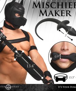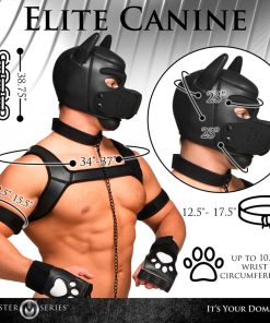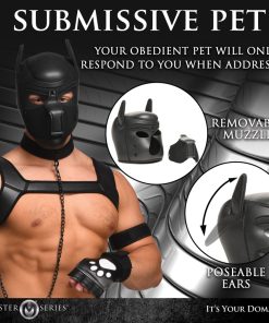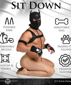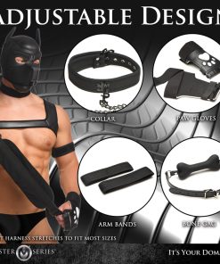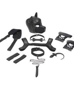 Get on all fours and bark! This Deluxe Pup Arsenal set has everything you or your partner need to jump into puppy play! Whether you take things ruff or gentle, you can use this gear to make your fantasy come to life. The kit includes a durable, stretchy, neoprene hood that has a removable muzzle and poseable ears. Go nonverbal by wearing the muzzle or easily remove it by popping off the snaps from the hood. Take advantage of that open mouth design, have some fun, lap up some water, or put some sausage in your mouth! Remove the hood entirely and you can enjoy wearing a silicone bone gag and happily chew on your favorite toy! To complete the look add in the stretchy bulldog harness, the velcro armbands and puppy mitts, and slip the smooth, firm, silicone butt plug inside! As you wear the plug, a silicone tail wags with every move of your booty! Let your owner or trainer walk you around proudly when you wear the adjustable collar and chain leash! What a good boy you are!