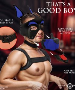 Step into your primal side with this pup hood! Designed for maximum visibility, it boasts large eye holes that allow you to keep a sharp lookout. A strap down the scalp holds the big, perky ears securely in place, showing off your hair for added flair. The protruding muzzle features a playful, red, panting tongue hanging out, enhancing your canine look. The muzzle and tongue are easily removable whenever you need to use your mouth, thanks to the handy snaps. Perfectly crafted to fit most heads, this pup hood offers a one-size-fits-all solution. Made from high-quality vegan leather, it looks authentic and is easy to maintain.
