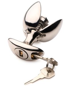 With the plug in a contracted position, use plenty of lube and slip the tip into your backdoor. For a more pleasant sensation, run warm water over the metal to warm it up before insertion. Once inside, use the circular flat key to expand the metal petals; only expand the petals to the degree that is comfortable and don’t force it! As you find the desired expansion, use the gold pin locking key to keep it in place so it doesn’t contract again until you let it. Make sure not to lose either key for safety reasons! Enjoy playing with your partner or even serving them and begging them to let you free after being locked into anal bondage! What will you do to earn release?