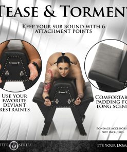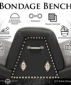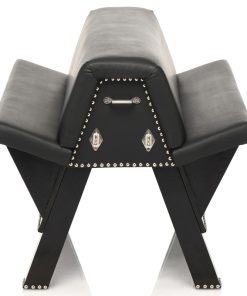 Transform your space by adding a classic bondage bench as the centerpiece of your pleasure. The classic design and smooth, black, vegan friendly leather with bold metal accents stand out and invite you to give in to your darker desires. The smooth faux leather feels divine against bare skin as you indulge in devious play with your partner! Restrain them to the bench with cuffs that attach to any of the 6 attachment points. Tease and torment your submissive to your heart’s delight by introducing different impact toys and play! This sturdy, wood and metal bench can handle up to 660 lbs so you both can hop on and enjoy each other. The padded cushions make it comfortable for you both to kneel, straddle or sit for sexy scenes! After play, simply wipe it clean until next time. All metal is nickel-free for sensitive skin.
