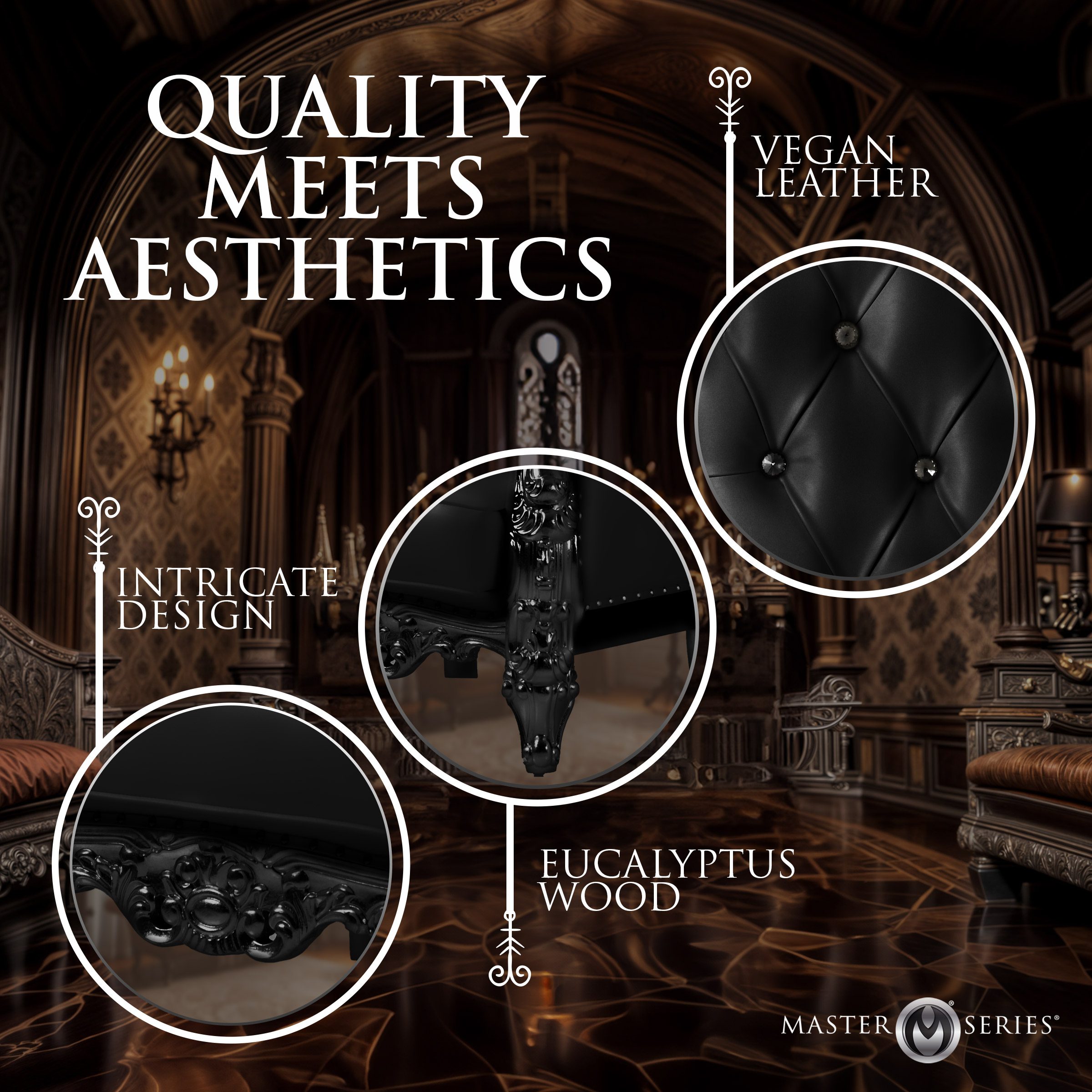 Indulge in sheer luxury with this majestic, plush, cushioned chair featuring intricate Victorian-style wood carvings gilded in resplendent silver. Crafted from durable eucalyptus wood, this elegant piece boasts a solid, wooden frame for lasting quality. The sumptuous, vegan-leather upholstery adorned with tufted backing is interspersed with gleaming glass buttons, exuding both comfort and sophistication. This chair arrives fully assembled, ready to become the centerpiece of any regal space.