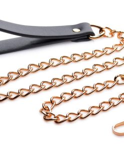 Leash up your sub in style with the included gold chain leash! The black PU leather hand loop matches the dazzling gold metal hardware to provide you a bondage accessory that lets you strut your sub in style around your home or your scene.