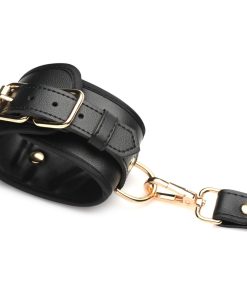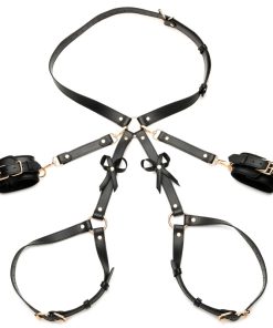 The use of your body is a gift; treat it like one with this bondage harness and wrap up your waist, thighs and wrists like a nice, little package -it even has bows included! Made out of durable PU faux leather, it is vegan friendly and easy to spot clean or wipe clean after each use. The wrist cuffs close using nickel-free, gold colored metal buckles. Adjust the buckles on the thigh straps, waist strap and wrist cuffs for a custom and comfortable fit. Accentuate your curves and make your partner drool with lust and desire as you present yourself as the object of their admiration, a bound and submissive playmate ready to spice up the night!