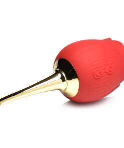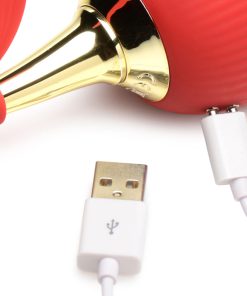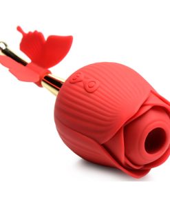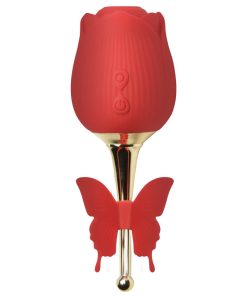 This fluttering butterfly, golden rod, and red rose are both pleasing to the eye as well as your vulva! The plush red petals of the rose are made of plush, premium, phthalate-free silicone and have a small, round hole that gently sucks at the clitoris using air-stim technology. Enjoy 10 different suction modes to tease and tantalize your little pearl. The stem of the rose is a golden rod with a round, beaded tip in the shape of a ball. Delight in an extra 10 vibration modes to enhance your pleasure as they rumble down the shaft of the stem and directly into the rod. The design of the stem allows you to pinpoint your pleasure points with targeted vibration for personalized satisfaction.