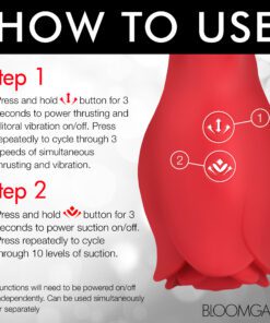 This rose is the complete package when it comes to female satisfaction! The stem of the rose is a slightly curved, flexible shaft with a round head and ribbing beneath the head. The rabbit ears vibrate and rest against your clit as you enjoy the auto-thrusting feature! There are 3 speeds of thrusting to enjoy that also turn on the vibration, too! Switch it around and use the rosebud and its powerful little suction hole to suck your clit with 10 different intensities to choose from! These can be operated simultaneously or at the same time if your femme partner wants to join on one side! You can even take it in the shower, too! It’s rated IPX6 waterproof so it can handle powerful jets, but should not be submerged underwater. Made out of premium quality, silky smooth silicone, it is also body-safe and phthalate-free. Use only with water-based lubricants for best results. To clean, wash with warm water and mild soap and then spray with a toy cleaner before patting dry. Recharge using the USB cable provided.