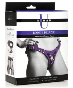 Peg your partner in style with this deluxe leather corset harness! Vibrantly colored, it is also beautiful, flattering to your figure, and comfortable to wear! Made out of leather, the outside is brushed so it is soft. It’s durable, long-lasting and forms to your body the more you wear it. Adjust the straps around the thighs and hips using the nickel-free, metal buckles. Adjust the back with stylish, corset-style closure that has nylon laces. Along the inside is a soft lining that reduces chafing and makes wearing it more comfortable for long scenes. At the front is a metal o-ring. Spot clean as needed.