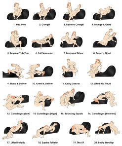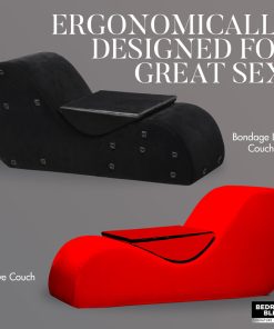 After placing wrist and ankle cuffs on them, hook their wrists up above their head and their ankles down below while they’re face up. With their legs spread, warm them up with some oral attention between their thighs. Once they’re warmed up, reposition them and climb on top! Or turn it into a scene and bring out the vibrators, feather ticklers, whips and floggers! Turn them to face you or put them in doggy! Have them upside down or right side up. Either of you can be high or low on the couch to adjust for different positions that help you both reach orgasmic new heights!