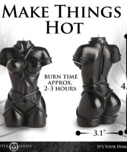 This stunning wax candle is sculpted to look like an anatomically correct woman’s torso! Bound in rope and showing off every sensual and strong curve and muscle, with perky breasts and a tight backside, it is almost too beautiful to burn! If you don’t use it as a decoration, enjoy this synthetic wax candle that has a low melting point and is unscented. Hold it 3 feet away from your partner and let it drip! It will easily and quickly start to flow after lighting it and ensure hours of sensual, exciting and stimulating erotic fun! Test out a small area of skin to see if there’s any sensitivities or allergic reactions before covering other erogenous zones. For easy removal, use a scraping device (such as a plastic card) to scrape the wax off their body when done, spank it off with a flogger, comb it, use ice and water, scratch it off with nails, or use natural oils to massage into the skin and hydrate the skin while removing the wax. Keep the wax away from any mucous membranes, keep it outside of the body, and avoid eyes and hair. Make sure to keep the candle away from any flammable materials.