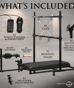 Key Features: Heavy-Duty Breeding Stand: Includes a heavy-duty steel frame, with a padded, vegan leather-covered wood platform. Multi-Speed Sex Machine: The machine is corded for non-stop power, a variable speed dial to fine-tune your speed, and an adjustable stand that accommodates any height or desired angle. Go Handheld!: The sex machine can also be detached and used as a handheld... Read more
