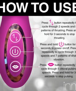 You deserve everything, all at once, to satisfy your desires! With this Bumping Bunny rabbit style vibrator you get G-spot stimulation, clitoral stimulation, thrusting and vibration all in one! The ribbed shaft auto-thrusts and vibrates simultaneously while the rabbit arm pulses against your sensitive clit. Enjoy 3 speeds and 7 patterns of vibration. Indulge in 2 speeds and 5 patterns of thrusting, as well! And as you get the shaft deep inside, line it up with your precious pearl so it can enjoy 5 different pulsing modes! Combine them all for blissful release! The toy is made out of silky smooth, satiny pink silicone. It is premium grade, phthalate-free and body-safe when used with water-based lubricants. Rated as IPX7 waterproof, it can handle being taken into the shower or even submerged underwater in the bathtub for up to 30 minutes! Recharge between play using the USB cable provided. To clean, wash with warm water and mild soap, then spray with a toy cleaner and pat dry.
