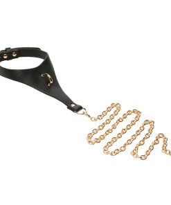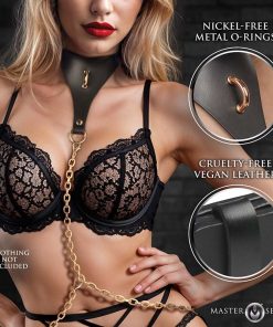 Elevate your kinky wardrobe with this sexy, vegan-leather bondage collar. Designed for ultimate comfort and adjustability, it features golden buckles to ensure the perfect fit for any neck size. This stunning collar is equipped with two D-rings — a large one at the front and a smaller one at the tip of the vegan-leather strap— ideal for attaching your favorite implements, chains, or accessories. The included detachable chain leash is perfect for guiding your submissive partner or wearing as a fashionable waist accessory. All metal components are nickel-free, making this collar not only stylish but also body-safe for everyone.