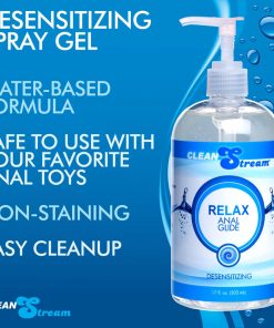 Relax Anal Lubricant is a desensitizing lube that can help ease some of the potential discomfort associated with anal play. This silky smooth liquid keeps unwanted friction at bay, and offers a light numbing effect to help keep things comfortable during backdoor exploration.