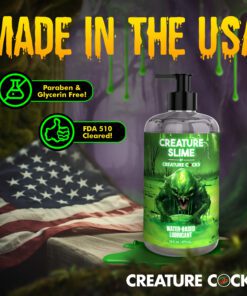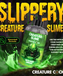This Creature Slime lubricant is super slippery and ready to get all your cracks, crevices, and holes nice and wet! Get ready for water-based slime that will drip without staining. Completely odorless, this unscented lube is also glycerin-free so it won’t mess up your pH and is safe to use internally! Clean-up is easy, too! Use water and soap to clean off the lube. Feel free to use it with any toy or person! It is compatible with all toys and made for sensitive bodies. Let your inner creature run free and get wet!