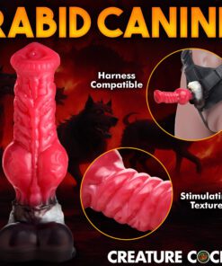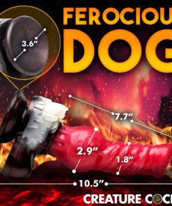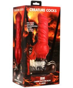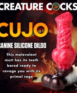 Get ready to howl with pain and pleasure as this Cujo Canine Dildo ravages you! Designed with a wild, dog or wolf-like animal in mind, this bright red shaft has a wide, pointed and flat head, rows of thick, ropey ridges along the shaft and a thick, round knot in the center. At the base is a tuft of white fur over shiny, brown skin and a pair of big balls at the base! The wide base provides powerful suction so you can go hands-free by placing it on any flat surface to keep it in place. You can also combine it with a compatible strapon harness for pegging play! Made out of premium, phthalate-free silicone, it has a firm core and soft, silky surface. Use only with water-based lubricants for best results. After play is over, wash the dildo with warm water and soap and use a toy cleaner to spray clean. Wipe dry and store in a cool, dark place out of direct sunlight.