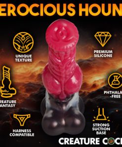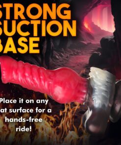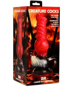 Get ready to howl with pain and pleasure as this Cujo Canine Dildo ravages you! Designed with a wild, dog or wolf-like animal in mind, this bright red shaft has a wide, pointed and flat head, rows of thick, ropey ridges along the shaft and a thick, round knot in the center. At the base is a tuft of white fur over shiny, brown skin and a pair of big balls at the base! The wide base provides powerful suction so you can go hands-free by placing it on any flat surface to keep it in place. You can also combine it with a compatible strapon harness for pegging play! Made out of premium, phthalate-free silicone, it has a firm core and soft, silky surface. Use only with water-based lubricants for best results. After play is over, wash the dildo with warm water and soap and use a toy cleaner to spray clean. Wipe dry and store in a cool, dark place out of direct sunlight.