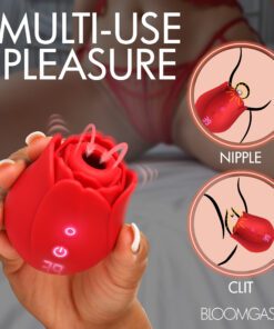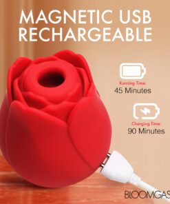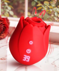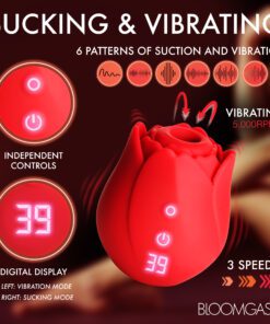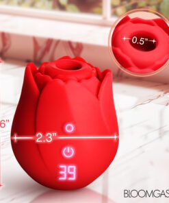 This rose is blooming for your pleasure! Indulge in vibration and suction that you control with an easy-to-read digital display that lights up on the side of the rose. There are 3 speeds and 6 patterns of both vibration and suction that will get you to blossom and spill your wet pollen! This handheld toy is travel-friendly, slips into bags, purses, or baggy pockets, and easily becomes your best friend in the bedroom! Use it solo or with a partner for enhanced fun! Made out of premium quality, silky smooth, phthalate-free, and body-safe silicone, use it only with water-based lubricants for best results. Rated IPX6 waterproof, it can be taken in the shower, but should not be submerged underwater. Wash with warm water and mild soap after each use, then spray it with a toy cleaner and wipe it dry. Recharge using the USB cable provided.