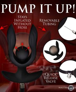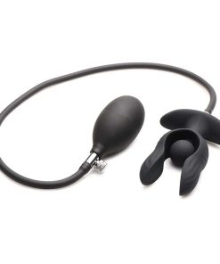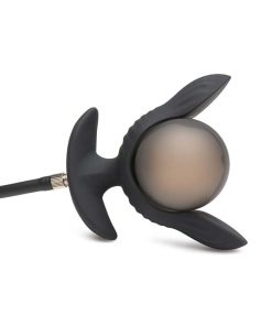 You lube up the plug after warming yourself up to receive. You gently push it inside, taking your time, and finally it pops inside. The unusual shape makes it so you have to grip it carefully and make sure both sides get in at the same time, but the ridges along the plug feels extraordinary! You start getting your derriere used to the feeling by turning on the vibration; the rumbling vibes relax your muscles and turn you on. Then you slowly start to squeeze the hand-pump. You feel the pearl-shaped bulb inflating, slowly adding pressure, and you stop when it’s almost too much. An adjustment using the release valve lets you get it to the perfect size. Then you detach the hose and you’re all set to play!