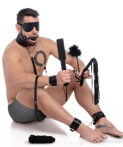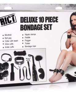 10 Bondage Essentials for anyone wanting to explore the dark side of their bedroom! Everything you need to tie up, gag, and punish your partner is included in this Deluxe 10 Piece Bondage Set: a thick blindfold, breathable ball gag, wide strap collar with leash, a set of wrist and ankle cuffs, a pair of nipple clamps, a versatile bundle of rope, a handy little paddle, a tempting tickler, and a satisfying flogger.