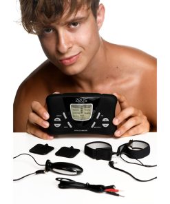 With fresh batteries in your power box and e-stim gel or water-based lube at your side, you find yourself a comfortable spot, alone, where no one can bother you. It’s private, and even if you choose to invite someone to join or watch, it’s definitely somewhere that feels safe to test out your delicious new equipment. You already feel yourself getting excited and the proof shows as you feel a strain against your pants as your little monster struggles to get free. You decided to start by putting everything in its place; the penis bands your slip over the top and bottom parts of your shaft, adjusting for a snug fit. The silicone pads are placed to stimulate your prostate; one above the pelvic bone in front and the other behind, right above the buttocks. Finally, you insert the anal plug with the help of a little more lube. As you plug in all the leads to the machine, you enjoy the option of being able to use any of them simultaneously or separately, making it easy to explore. The 7 different styles of stimulation are almost more than you can take! They surprise you and then you feel the intensity rising as you change settings and levels! Before you know it you’re having the most mind blowing experience ever! To your delight and surprise, the electricity invites you to keep going, even after you’ve exploded!