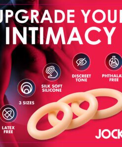 Last longer and stay harder with this silicone cock ring set! These three graduated rings give you a chance to try out three different sizes and find the perfect fit. Choose colors that match your skin tone for a more neutral look and enjoy premium silicone that is phthalate-free, body-safe, latex-free, and best used with water-based lubricants only. Stretch the rings around your shaft, balls, or both. Use them alone or combine them for added pressure and sensation!