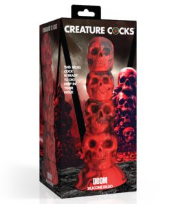 This hellspawned Creature Cock dildo is truly inspired by horrors and dark magic! The tower of skulls is 4 red skulls with different shaped eye sockets and jaws stacked upon each other. Enjoy the round head that penetrates and the dozens of grooves and ridges from the unique texture! Made out of premium, silky smooth, phthalate-free silicone it has a squishy outside and firm, flexible core that is body-safe. Only use water-based lubricants for best results. The strong, suction-cup base lets you ride hands-free when it’s placed on any flat surface. It’s harness-compatible so you can enjoy it with a partner or attach the harness to a chair or bench. Enjoy your kinky cosplay, fantasy roleplay, and self-pleasure with this fantasy dildo! After play, wash with warm water and mild soap then spray with a toy cleaner and let it air dry.