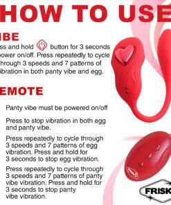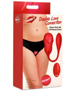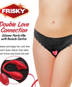 Get Frisky with this discreet, powerful, Double Love Connection panty vibe! The panty vibe is ergonomically designed to fit perfectly between your thighs and has a corded egg that slips inside and stimulates your G-spot! The powerful dual motor buzz with 3 speeds and 7 patterns of vibration both inside and against your clit! The panty vibe stays perfectly in place when positioned against your clit on the inside of your panties and then connected to the magnetic heart on the other side of the fabric. Let your partner rock your world from up to 19.7 feet away with the wireless remote! Enjoy an adventure or risky public play when only the two of you know about it! The toy is made out of silky smooth, premium silicone and is body-safe and phthalate-free. Use only with water-based lubricant. Both the remote and vibrator are USB rechargeable. To wash, use warm water and mild soap, then spray with a toy cleaner and pat dry.
