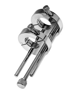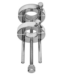 This extreme CBT device is one of the most intense ball stretchers we offer. Finely crafted out of smooth, gleaming stainless steel, it is designed to trap the scrotum and slowly stretch it out until you have reached the limits of what can be endured. Not for the faint of heart, this deviant piece is basically a rack for the balls. Secure both rings above the testicles, right at the base of the scrotum. Twist down the screws at the side of each ring to lock them in place. Then, slowly turn the large screw, which pulls the rings apart, stretching the scrotum between them. Not only do you get the sensation of the rings forcing your ball sack to stretch, but the weight of the piece itself creates a downward pull for even more pressure. Whether you slightly space the rings for gentle resistance for increased pleasure during stimulation, or test the limits of torture, this exquisite piece is sure to give you a lifetime of play.