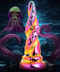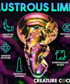 Transform your sex toy collection with phenomenal additions from Creature Cocks! This Kraken dildo has an iridescent, metallic, rainbow of colors featuring bright pink and yellow gold! It is made out of a firm, super smooth borosilicate glass. This kind of glass is the same that you often find in kitchenware and is not only durable and high quality, it also can handle temperature changes so you can enjoy warming it up or cooling it down before insertion! The tip is tapered to make insertion easier and it gradually widens towards the base. Along the shaft are spirals of octopus tentacles with small suckers that add texture to the shaft and stimulate you with each deep plunge within your watery depths! The base is flared so you can combine it with a strapon harness as long as the O-rings are soft. Make sure to use soft O-rings on the firm glass such as silicone or rubber and never use it with metal O-rings! This glass dildo is phthalate-free and body-safe to use with any lubricant type. To wash, use warm water and mild soap then rinse and spray it with a toy cleaner. It is dishwasher safe but exposure to boiling water may result in the color fading.
