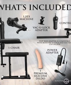 Note: Use water-based lubricant only on the silicone dildo. Keep dildo and chair out of direct sunlight and away from heat to preserve quality.