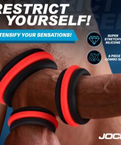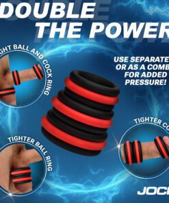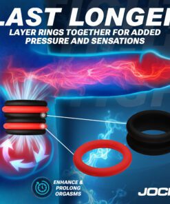 Take your enjoyment to new heights with this expertly designed set of cock rings. Featuring a removable center piece, these rings provide a flexible way to explore and customize your pressure and play. Try stacking them, swapping positions, or using them as either ball stretchers, cock rings, or both! Feel soft pressure with the black ring or add intensity with the vivid red center-ring for a tighter feel. With a range of sizes, you’ll discover the perfect match for your shaft or balls. Made with top-notch stretchy silicone, these body-safe rings ensure comfort, durability, and plenty of ways to enhance your sensations.