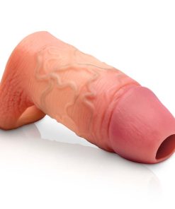Short and Fat: This dong enhancer sleeve has realistic veins and shape, but is extra wide and on the shorter side for an extra-big stretch of your partner’s entrance!