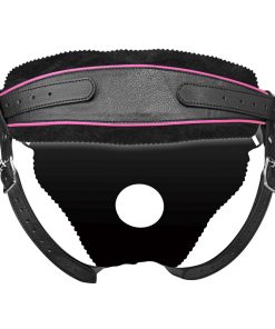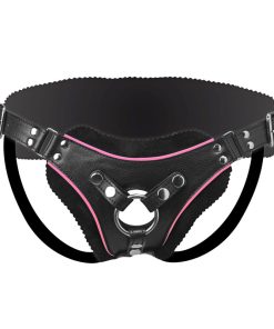 This vegan-friendly strap on harness has exciting pink accents and a low-cut designed to help draw their eye and keep their attention fixed on you. The belt is fully adjustable, with buckles at the hips and rear straps for a tight fit. The back is wide for more support, and lined with soft fabric for comfort. The front has an easy snap-in feature. Using one of the two included steel O-rings, you can add your favorite dildo, with multiple size options. The open-back design still leaves everything open for easy access.