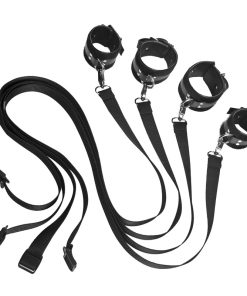Allow yourself the freedom of giving up control with this eight piece bondage set from Frisky. Imagine yourself doted upon and teased. Lying there in sublime ecstasy, anticipating every move and waiting for the next direction. This beginners bondage set is as comfortable as it is seductive. Made of faux fur details and the softest leather, these cuffs will keep you pleasurably subdued for hours! The adjustable straps and buckles ensure a comfortable experience for the wearer. Each cuff has a solid D-ring and attached easily to the straps with a claw closure. The buckles fasten securely using the grommeted faux leather strap. Use your imagination, this bedroom restraint kit is travel friendly!