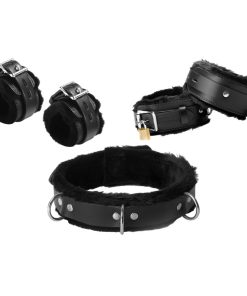 This top of the line bondage kit contains our best selling fur lined leather collar, with two fur lined wrist cuffs and two ankle cuffs. Each has a rolling buckle with a lockable clasp, double layered for security and durability. The D-rings on the front allow you to attach ropes, chains, or hooks for more accessory options. They can be... Read more