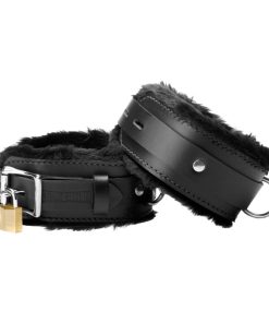 This top of the line bondage kit contains our best selling fur lined leather collar, with two fur lined wrist cuffs and two ankle cuffs. Each has a rolling buckle with a lockable clasp, double layered for security and durability. The D-rings on the front allow you to attach ropes, chains, or hooks for more accessory options. They can be attached to bed posts, bars, or each other. Now you can have all your bondage staples, all in one place and at a great price.