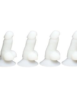 Four Mini Dildos! This fun pack includes four mini dildos that are designed to be noticed and are ready to stand upright on their own. With a strong suction cup base, they easily adhere to most flat surfaces. For added fun, the glow in the dark dildos are eye catching even in the dark! These little novelties make perfect gifts for bachelor or bachelorette parties, playful office decor, or for pranking your friends. Made from premium, phthalate-free, body-safe silicone, these mini dildos combine quality with cheeky fun.