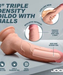 Triple Density Dildo with Balls: Experience unmatched pleasure with this triple-density dildo. Featuring an extra layer of soft, stretchy material, it delivers a thick, realistic feel. Its firm inner core and flexible outer layers enhance sensation, while the veiny shaft and slightly bent design offer realism from head to base. The suction-cup base provides stability for hands-free use, and it’s also compatible with most strap-on harnesses. Made from phthalate-free, latex-free, body-safe rubber, it’s perfect for safe and satisfying play with water-based or silicone-based lubricants.