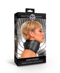 The Hard Stance Padded Locking Posture Collar is your go-to accessory for obedient submissives and controlled play! The adjustable and lockable straps let you achieve a snug, reliable fit, while a layer of soft padding offers enhanced comfort for prolonged wear. Vegan leather construction gives it an authentic look and makes maintenance a breeze. Use the D-ring at the front to attach a leash or other accessories, expanding the possibilities for your play. Perfect for those looking for a mix of style, comfort, and functionality.