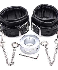 The ankle cuffs can be adjusted to find the perfect fit and feature three D-ring attachment points to fasten your choice of restraints to lock them down further! The ankle cuffs feature locking buckles if you choose to add your favorite padlock into the mix. The Ball stretcher ring features additional attachment points for more weights or more restraints – experiment with your lover and see how far you can stretch their limits!