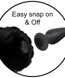 This little black bunny tail fits perfect on a SnapOn Tailz silicone anal plug! Let your sultry and seductive side show as you show off your dark desires. Wear it with matching lingerie and accessories to really set the scene and explore how many ways you can make your partner hip-hoppin happy! The SnapOn base is made of ABS plastic. The soft, bunny tail is made of vegan friendly polyester. Spot clean as needed using mild soap and water.