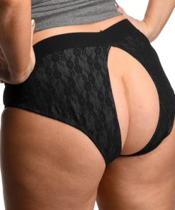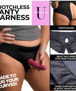 This great alternative to a strapon harness is comfy and compatible with all dildos! Play with a different dynamic with this Crotchless Panty Harness! This harness has a universal O-ring that can fit any strapon dildo. The wide, elastic waistband is comfortable and hugs you above the hips. Designed so that you can both give and receive pleasure during play, it is crotchless and has an open back that exposes your booty, too! This comfortable, easy to play in, supportive panty is made of nylon and is machine washable on a cold cycle. It can also be hand washed in mild soap and cool water.